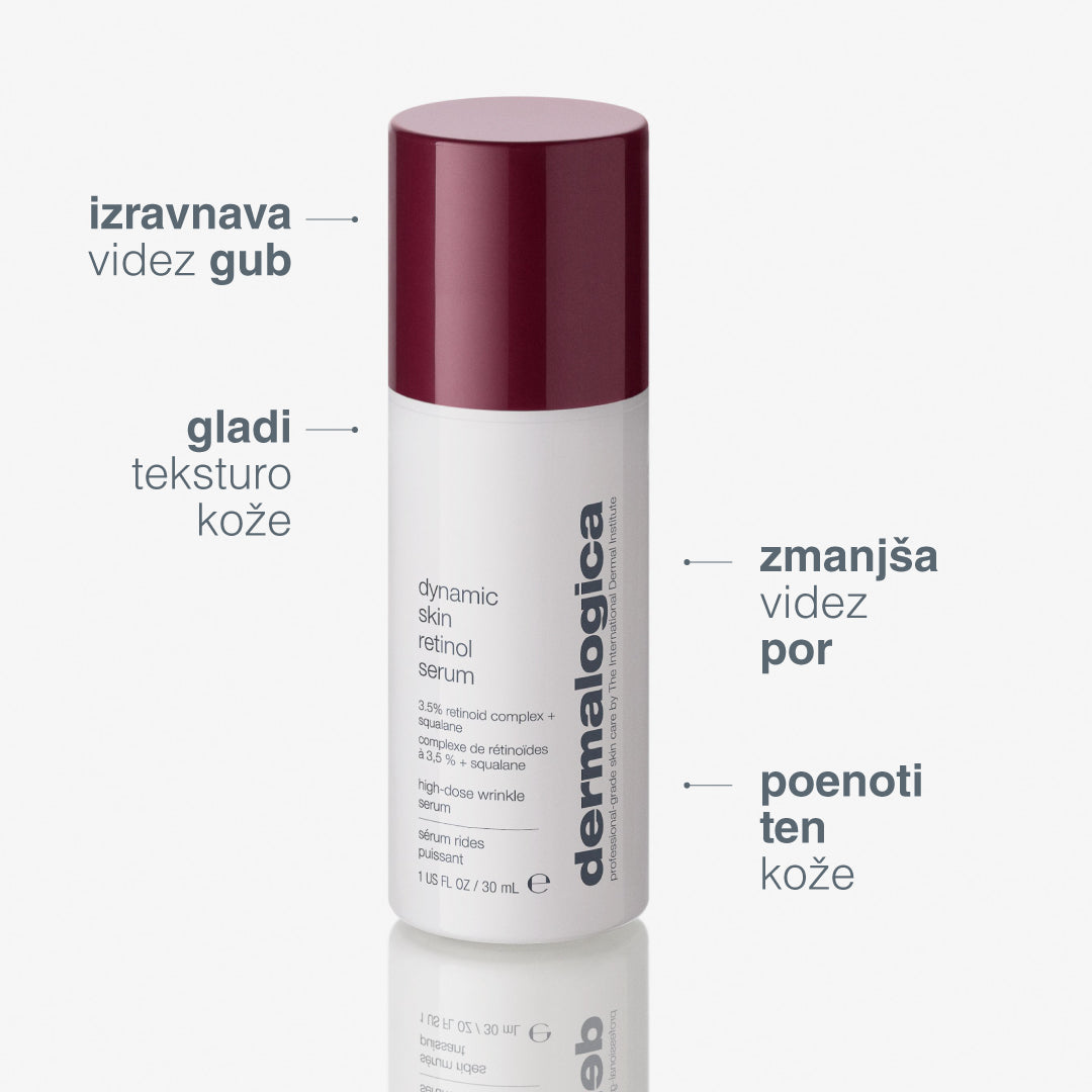 Dynamic Skin Retinol Serum, dinamični retinol serum za obraz, z visokim 3,5% odmerkom retinola vidno zmanjša 4 znake staranja kože v samo 2 tednih. Serum z visokim odmerkom retinola je dovolj nežen za nočno uporabo.